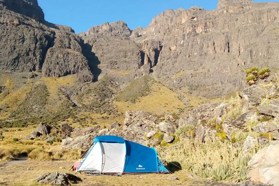 After breakfast, you will follow the trail as it leads up through glades of montane forest climbing away from Lake Ellis on its west side, across moorland to a ridge which eventually joins the main Chogoria trail. Lunch will be served at the camp this is possible as our crews always walk ahead of guests to make sure the tents and the Lunch is on time just before we get into the camp. Beautiful views of Vivienne Falls and the Gorges Valley on descent to the picturesque campsite next to Lake Michaelson. Dinner and overnight will be served in the same Camp.